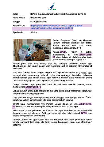 Judul : BPOM Siapkan Alternatif Vaksin untuk Penanganan Covid-19
