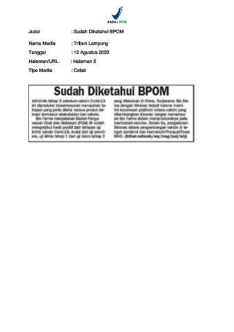 Judul : Sudah Diketahui BPOM Nama Media : Tribun Lampung Tanggal : 12 Agustus 2020 Halaman/URL : Halaman 3 Tipe Media : Cetak