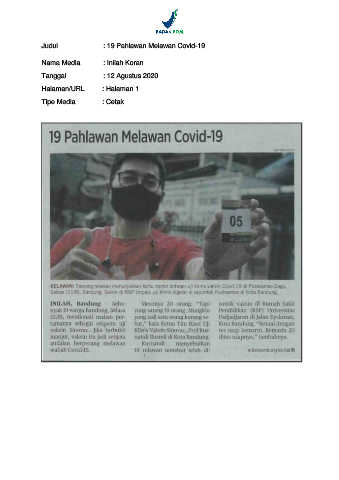 Judul : 19 Pahlawan Melawan Covid-19 Nama Media : Inilah Koran Tanggal : 12 Agustus 2020 Halaman/URL : Halaman 1 Tipe Media : Cetak