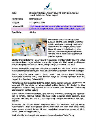 Judul : Sebelum Diekspor, Vaksin Covid-19 akan Diprioritaskan