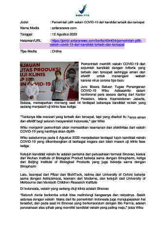 Judul : Pemerintah pilih vaksin COVID-19 dari kandidat terbaik dan tercepat