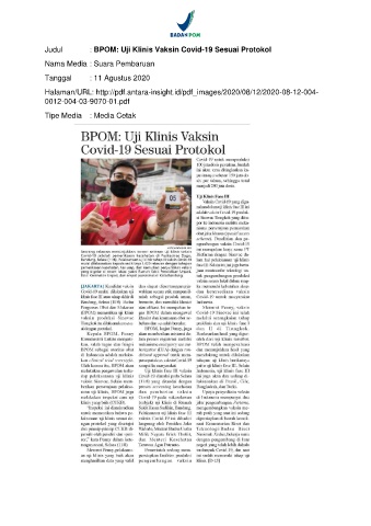 Judul : BPOM: Uji Klinis Vaksin Covid-19 Sesuai Protokol