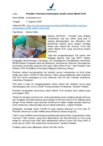 Judul : Presiden: Indonesia kembangkan sendiri vaksin Merah Putih