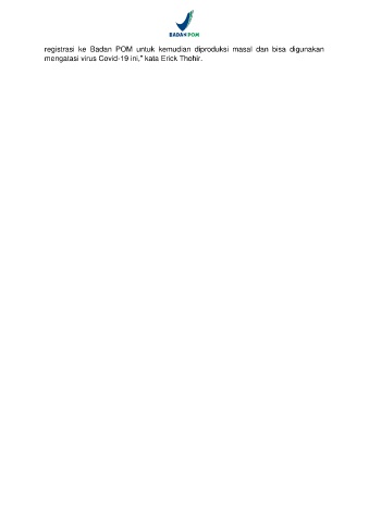 registrasi ke Badan POM untuk kemudian diproduksi masal dan bisa digunakan mengatasi virus Covid-19 ini," kata Erick Thohir.
