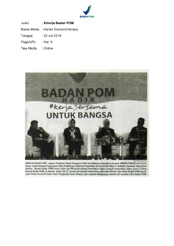 Judul : Kinerja Badan POM Nama Media : Harian Ekonomi Neraca Tanggal : 22 Juli 2019 Page/URL : Hal. 9 Tipe Media : Online