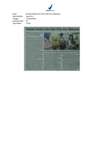 Judul : Mudah Deteksi Izin Edar Obat dan Makanan Nama Media : Jawa Pos Tanggal : 7 September Halaman/URL : 25 Tipe Media : Cetak
