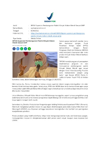Judul : BPOM Supervisi Pembangunan Pabrik Minyak Makan Merah Sesuai GMP