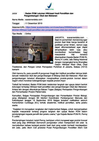 Judul : Badan POM Lakukan Hilirisasi Hasil Penelitian dan