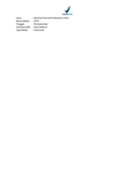 Judul : Hati-hati Kosmetik Diendorse Artis Nama Media : SCTV Tanggal : 26 September Halaman/URL : Halo Selebriti Tipe Media : Elektronik
