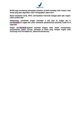 Avigan dan Klorokuin diyakinii sejumlah Negara telah efektif mempercepat
