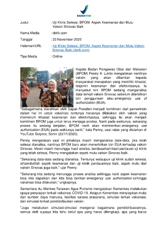 Judul : Uji Klinis Selesai, BPOM: Aspek Keamanan dan Mutu
