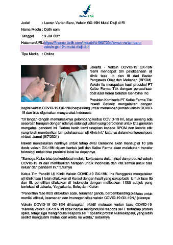 Judul : Lawan Varian Baru, Vaksin GX-19N Mulai Diuji di RI