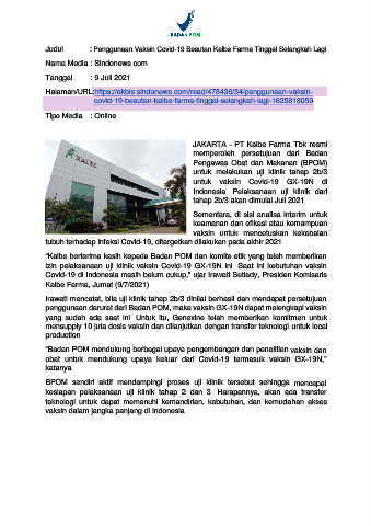 Judul : Penggunaan Vaksin Covid-19 Besutan Kalbe Farma Tinggal Selangkah Lagi