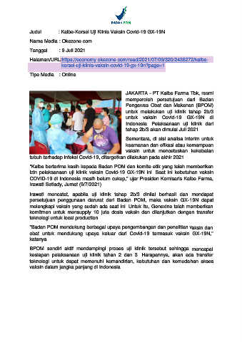 Judul : Kalbe-Korsel Uji Klinis Vaksin Covid-19 GX-19N