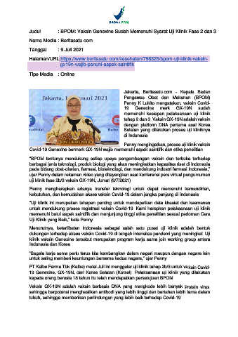 Judul : BPOM: Vaksin Genexine Sudah Memenuhi Syarat Uji Klinik Fase 2 dan 3