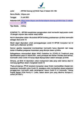 Judul : BPOM Dukung Uji Klinik Fase 2 Vaksin GX-19N
