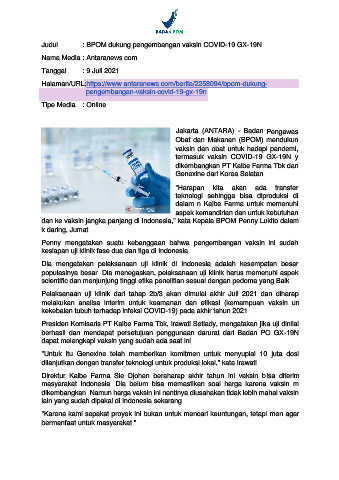 Judul : BPOM dukung pengembangan vaksin COVID-19 GX-19N