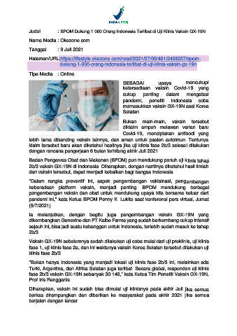 Judul : BPOM Dukung 1.000 Orang Indonesia Terlibat di Uji Klinis Vaksin GX-19N