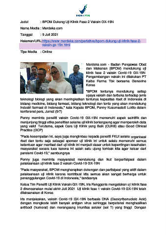 Judul : BPOM Dukung Uji Klinik Fase 2 Vaksin GX-19N