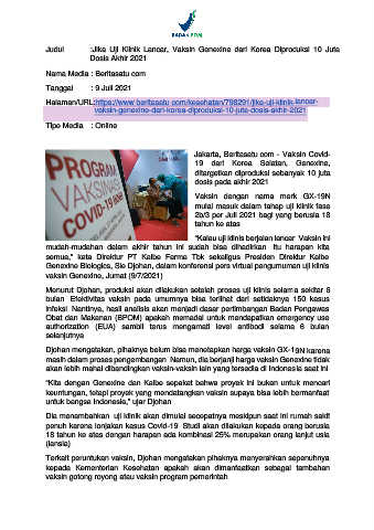 Judul :Jika Uji Klinik Lancar, Vaksin Genexine dari Korea Diproduksi 10 Juta