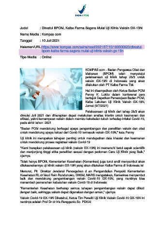 Judul : Direstui BPOM, Kalbe Farma Segera Mulai Uji Klinis Vaksin GX-19N