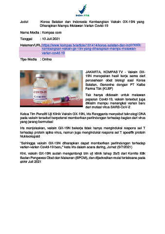 Judul :Korea Selatan dan Indonesia Kembangkan Vaksin GX-19N yang
