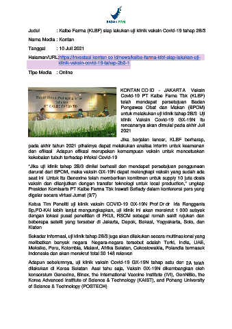 Judul : Kalbe Farma (KLBF) siap lakukan uji klinik vaksin Covid-19 tahap 2B/3