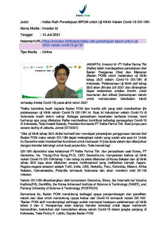 Judul : Kalbe Raih Persetujuan BPOM untuk Uji Klinik Vaksin Covid-19 GX-19N