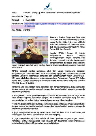Halaman/URL:https://www.tagar.id/bpom-dukung-uji-klinik-vaksin-gx19-n-dilakukan-