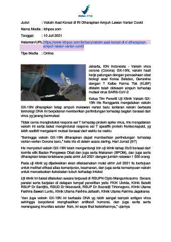 Judul : Vaksin Asal Korsel di RI Diharapkan Ampuh Lawan Varian Covid