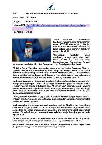 Judul : Kemenkes Sambut Baik Vaksin Baru Dari Korea Selatan