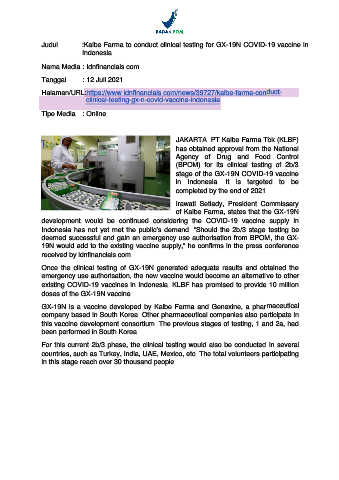 Judul :Kalbe Farma to conduct clinical testing for GX-19N COVID-19 vaccine in