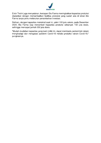 Erick Thohir juga menyatakan, kesiapan Bio Farma meningkatkan kapasitas produksi