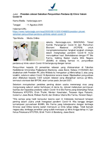 Judul : Presiden Jokowi Saksikan Penyuntikan Perdana Uji Klinis Vaksin