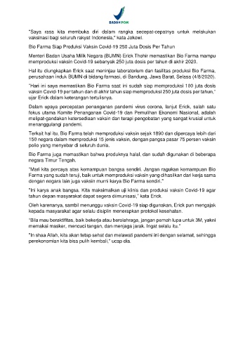 “Hari ini saya memastikan Bio Farma saat ini sudah siap memproduksi 100 juta dosis