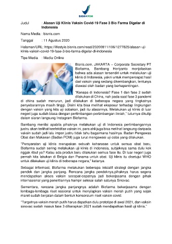 Judul : Alasan Uji Klinis Vaksin Covid-19 Fase 3 Bio Farma Digelar di