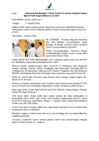 Judul : Indonesia Kembangkan Vaksin Covid-19, Jokowi Pastikan Vaksin