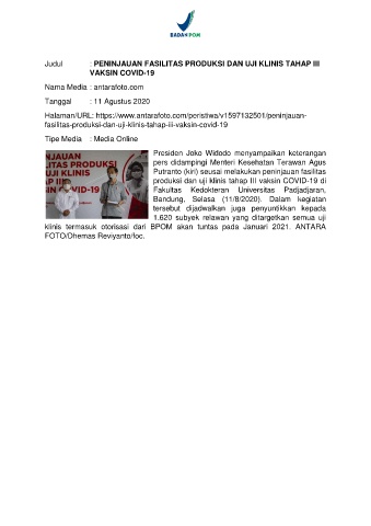 Judul : PENINJAUAN FASILITAS PRODUKSI DAN UJI KLINIS TAHAP III