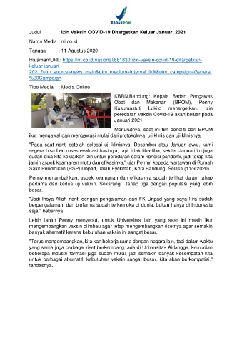 Judul : Izin Vaksin COVID-19 Ditargetkan Keluar Januari 2021