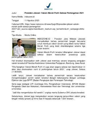 Judul : Presiden Jokowi: Vaksin Merah Putih Selesai Pertengahan 2021
