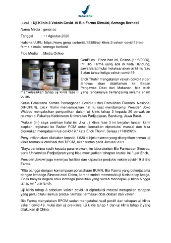 Judul : Uji Klinis 3 Vaksin Covid-19 Bio Farma Dimulai, Semoga Berhasil