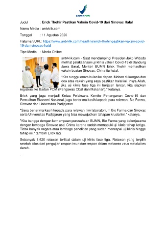 Judul : Erick Thohir Pastikan Vaksin Covid-19 dari Sinovac Halal