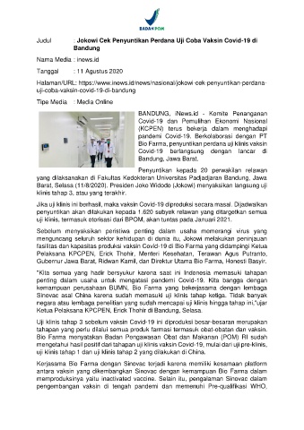 Judul : Jokowi Cek Penyuntikan Perdana Uji Coba Vaksin Covid-19 di