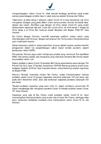 Klinis tahap 2 di China dan hasilnya sudah diketahui oleh Badan POM RI”, kata