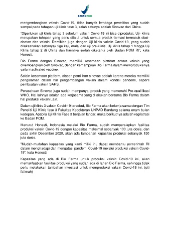 Klinis tahap 2 di China dan hasilnya sudah diketahui oleh Badan POM RI”, kata