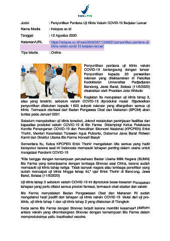 Judul : Penyuntikan Perdana Uji Klinis Vaksin COVID-19 Berjalan Lancar
