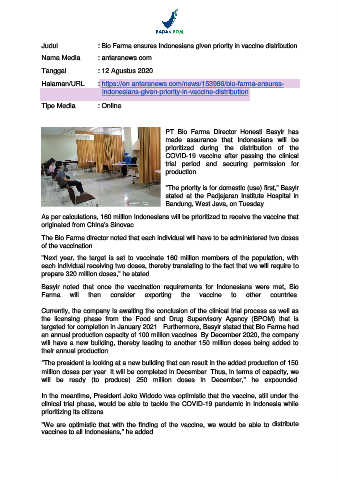 Judul : Bio Farma ensures Indonesians given priority in vaccine distribution