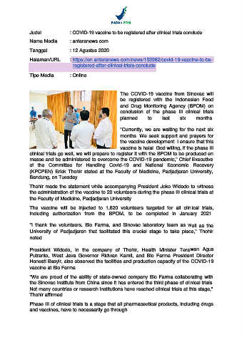 Judul : COVID-19 vaccine to be registered after clinical trials conclude