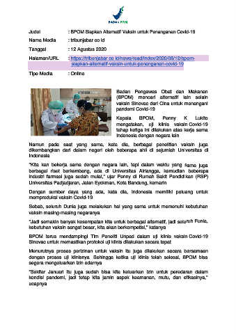 Judul : BPOM Siapkan Alternatif Vaksin untuk Penanganan Covid-19