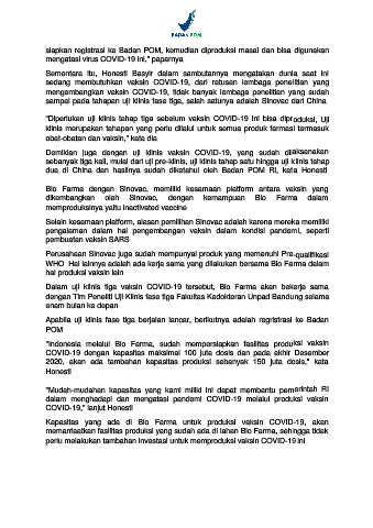 dua di China dan hasilnya sudah diketahui oleh Badan POM RI, kata Honesti.